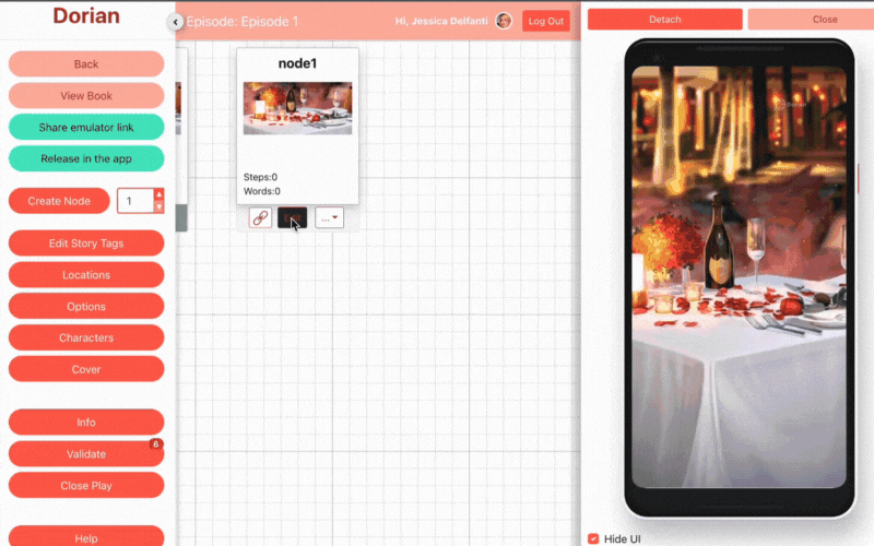 To create a new game, open the engine home page. You will see a number of buttons on the left side. Click the “Create story” button, and click into your episode 1 to see the node map.