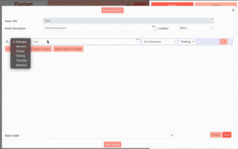 This page will teach the basics of how to begin using the Dorian editor to add dialogue, narration, and choices. Try this out while you’re still concepting your game to understand how Dorian works!